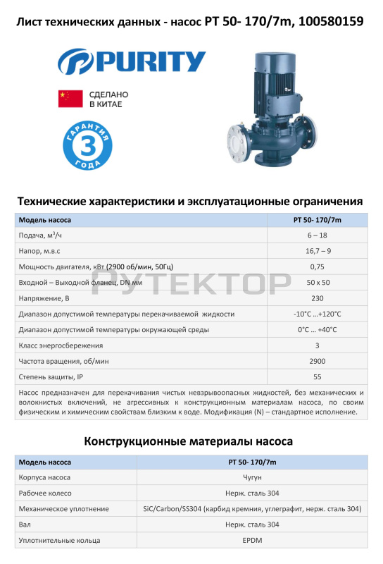 Насос моноблочный в линию PURITY PT 50-170/7 m